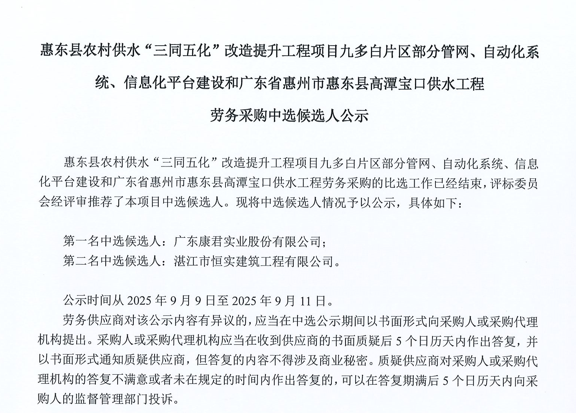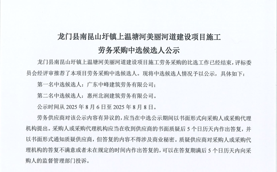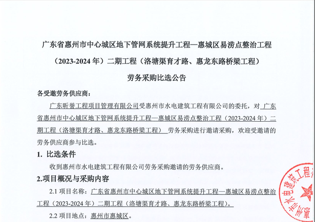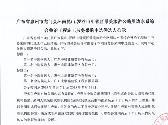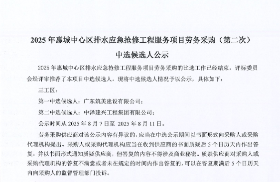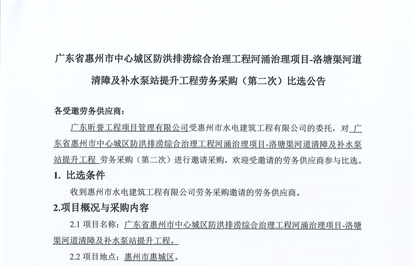 廣東省惠州市中心城區防洪排澇綜合治理工程河涌治理項目-洛塘渠河道清障及補水泵站提升工程勞務采購(第二次)中選候選人公示……